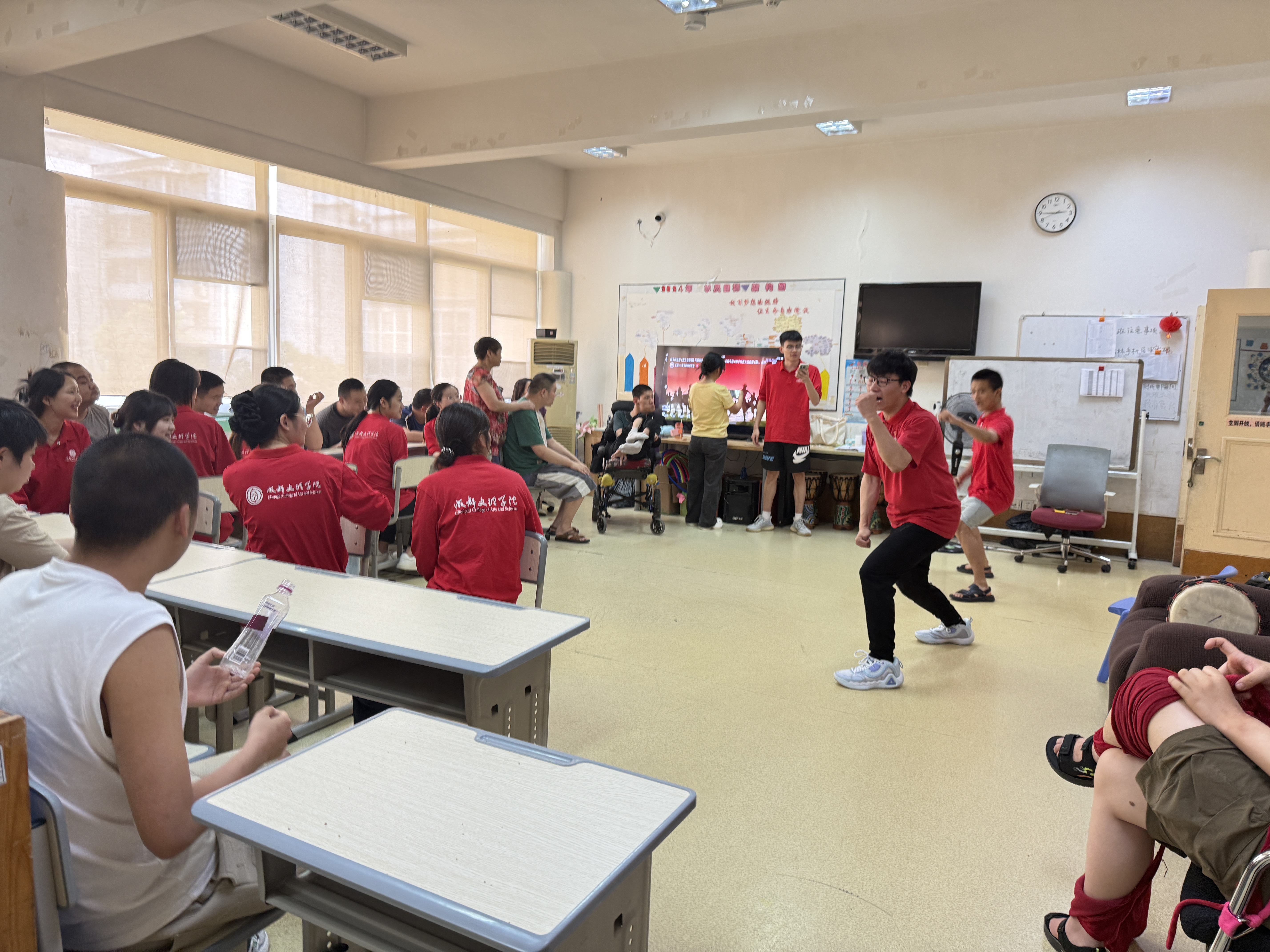 活动通过三个精心设计的互动环节,生动展现了基层党组织对特殊群体的关怀,体现了新时代党员的社会担当。一是支部退役士兵党员的军体拳展演环节。以刚健有力的军事动作展示军人党员风采,形成视觉与精神的双重激励,特殊群体学员在观摩中获得感官刺激与情绪振奋。二是手势舞蹈环节。选择《世界赐予我的》作为载体,歌词“爱是永不止息”暗合本次活动主旨,通过肢体语言打破沟通壁垒,建立情感联结。三是结合即将到来的端午节龙舟制作环节。通过传统工艺与现代助残理念结合,具象化“同舟共济”精神,一对一协作模式,促进党员与成员的沟通交流并激发学员艺术创造力。