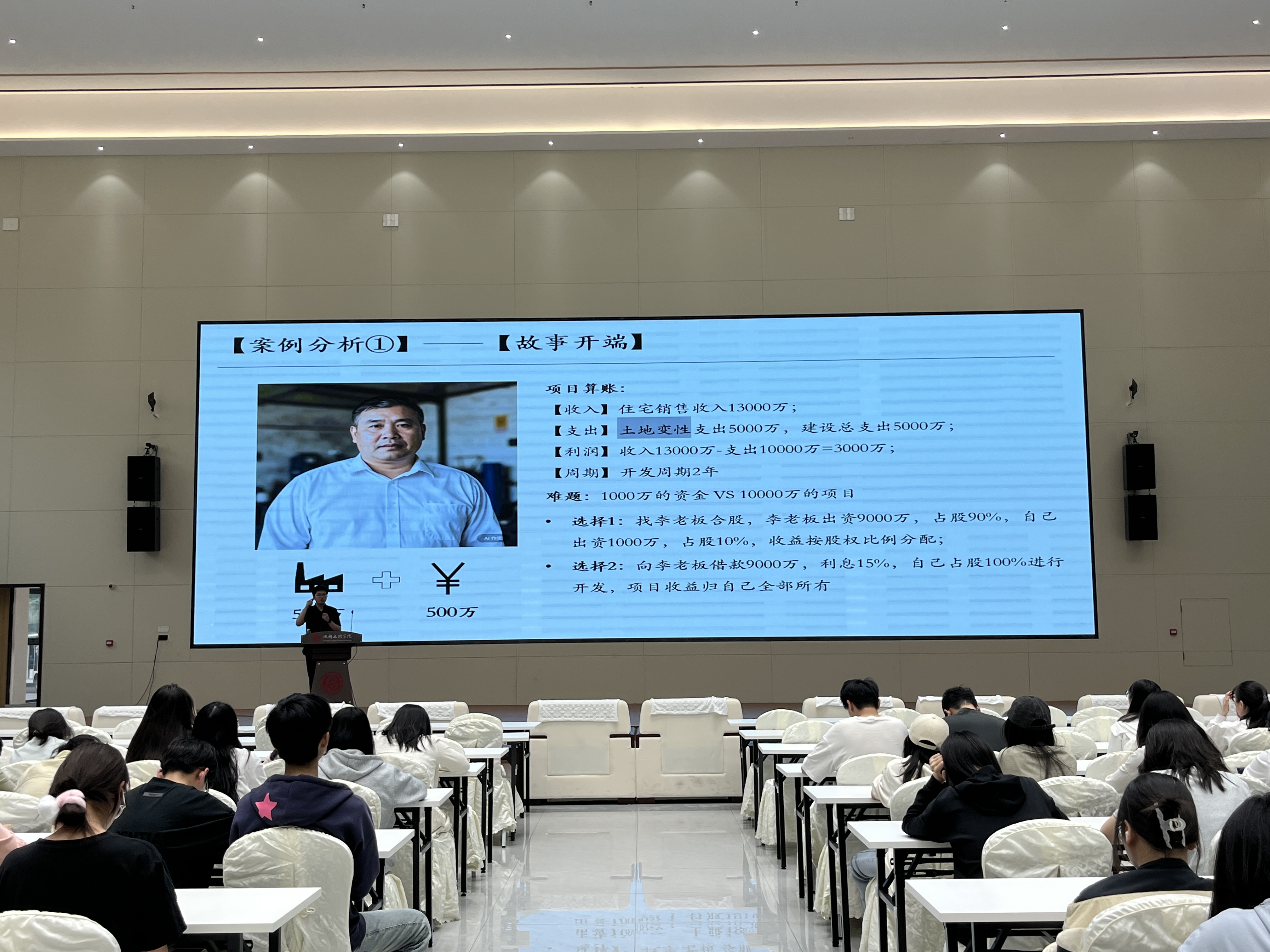 吴老师首先通过房地产行业四个不同发展阶段的生动案例,为同学们介绍了房地产市场主要的融资模式,用简单的投资模型展现了地产行业“快周转”模式下杠杆对股东利润的放大机制。