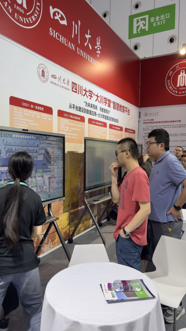 为向本省优秀985大学取经,在四川大学展台具体地解了其AI技术赋能的“大川学堂”智慧教育平台。该平台集成了丰富的教学资源,包括课程视频、课件、试题库、案例库等,同时具备强大的教学管理功能,如课程智能体建设、学情分析、课堂互动等。平台通过AI技术赋能教学全过程,从课前备课到课中互动,再到课后学情分析,为教师和员工提供了全方位的支持。智慧教育平台以其先进的技术、丰富的功能和创新的应用,吸引了众多参观者的关注,为教育数字化转型提供了有益的借鉴和参考。