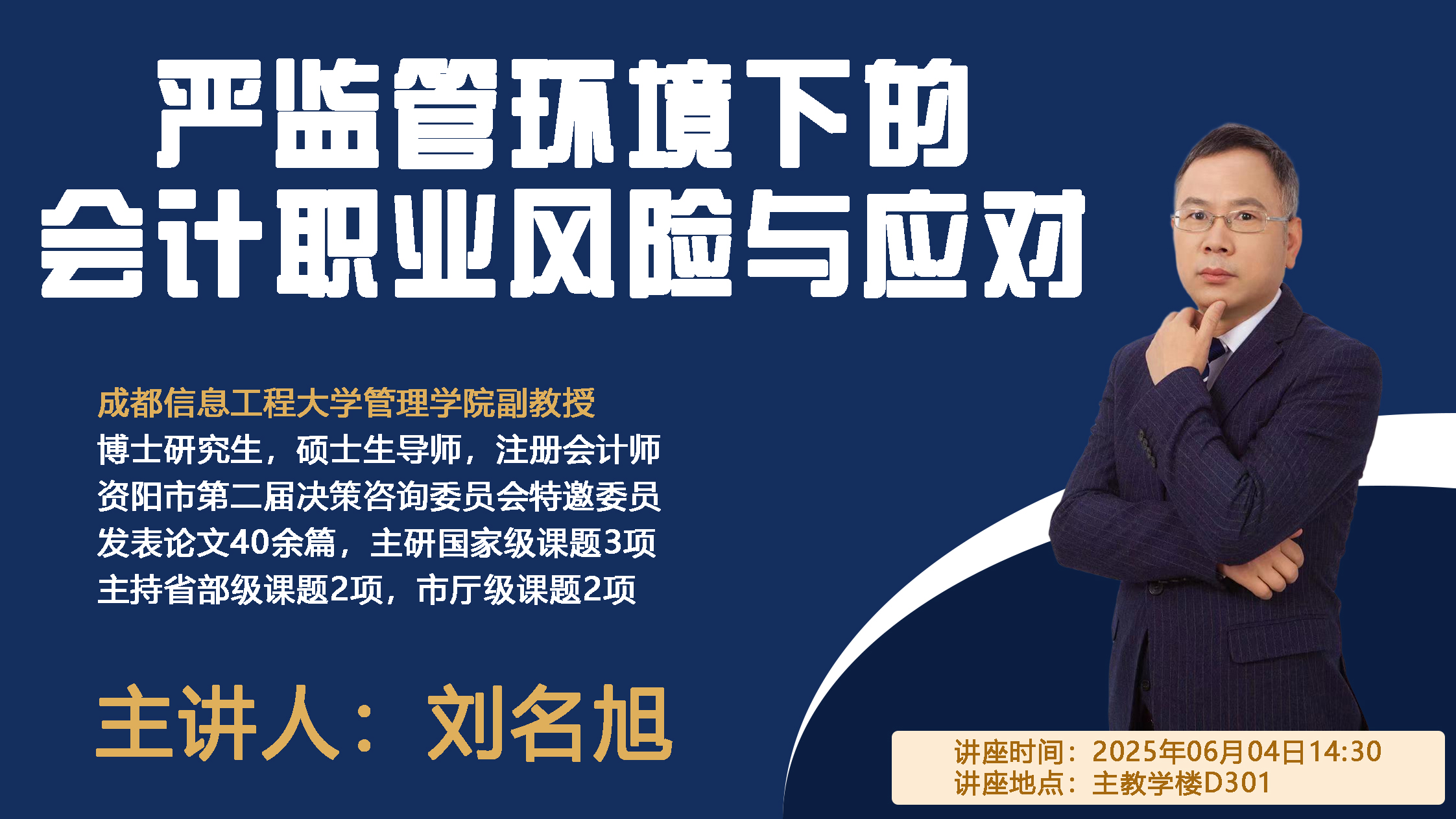 主讲人简介:博士研究生,注册会计师,曾任上市公司独立董事及企业财务顾问,现任成都信息工程大学管理公司副教授,硕士生导师,资阳市第二届决策咨询委员会特邀委员。主要从事资本市场财务与会计及审计问题研究,在《财经科学》《山西财经大学学报》、《宏观经济研究》、《中国注册会计师》等期刊中发表论文40余篇,主持省部级课题2项,市厅级课题2项,主研国家级课题3项。